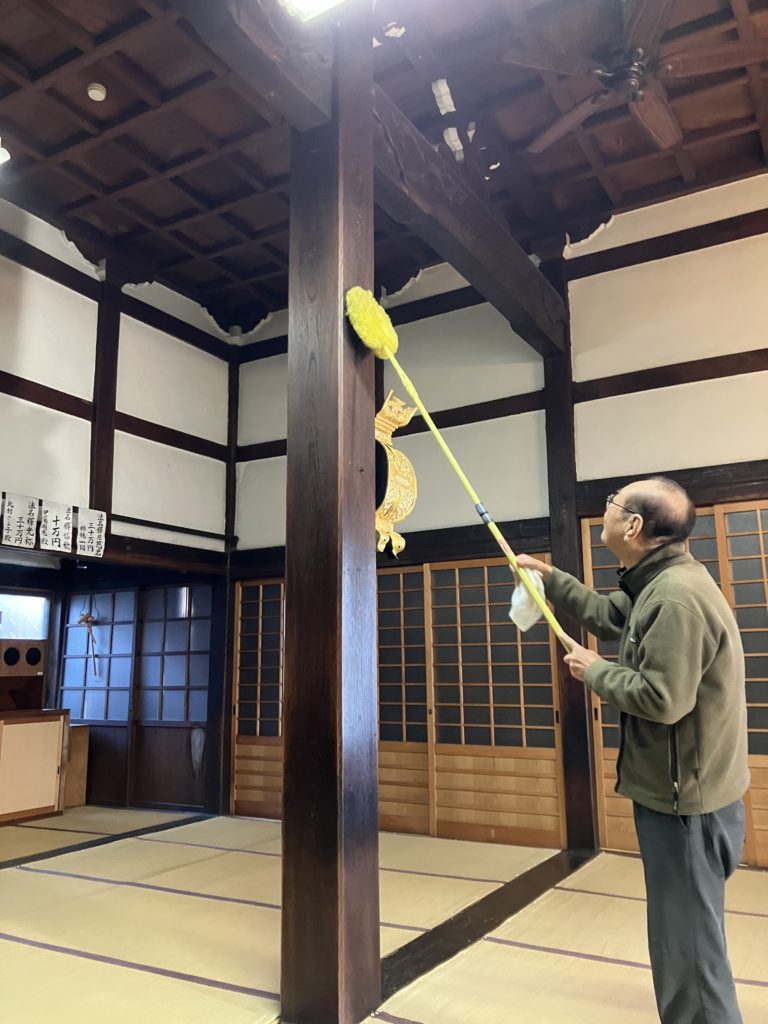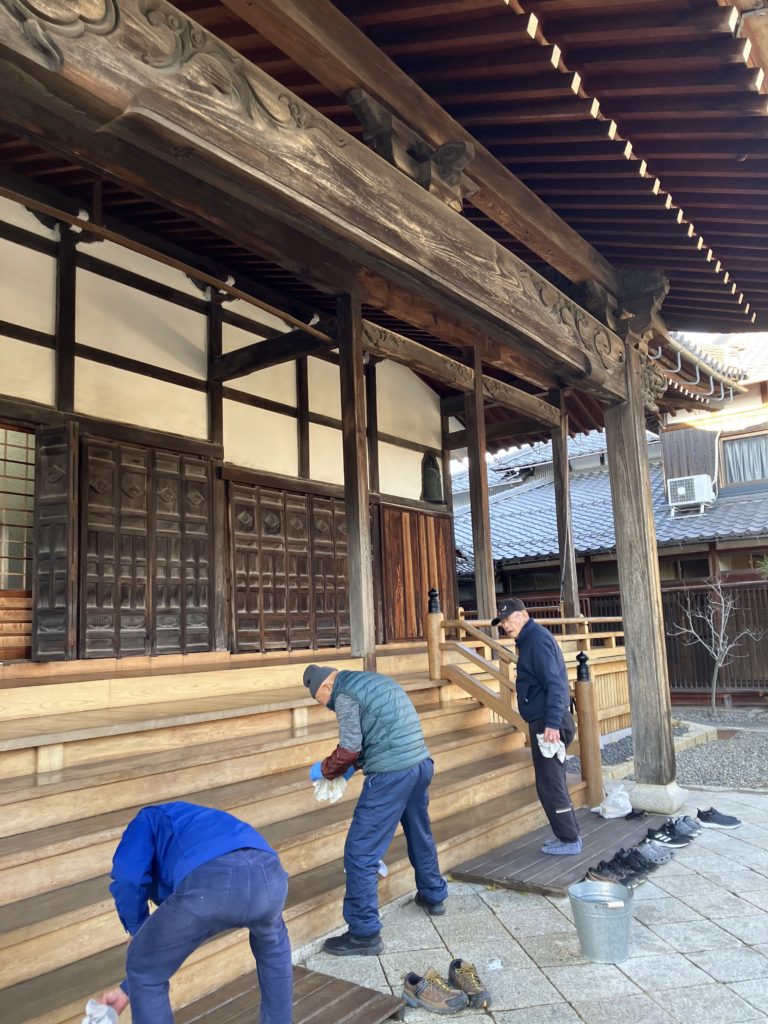 年末恒例の煤払いでした。今朝の彦根はかなり冷え込み、本堂の屋根もうっすら雪が積もりました。日の後半は、晴れ間も出て絶好の掃除日和になりました。煤払いの後は、こちらも恒例の鳥すき。そして鮒寿司をいただきました。世話方の皆さんはよく飲まれる方が多く、用意したお酒も全部無くなりました。